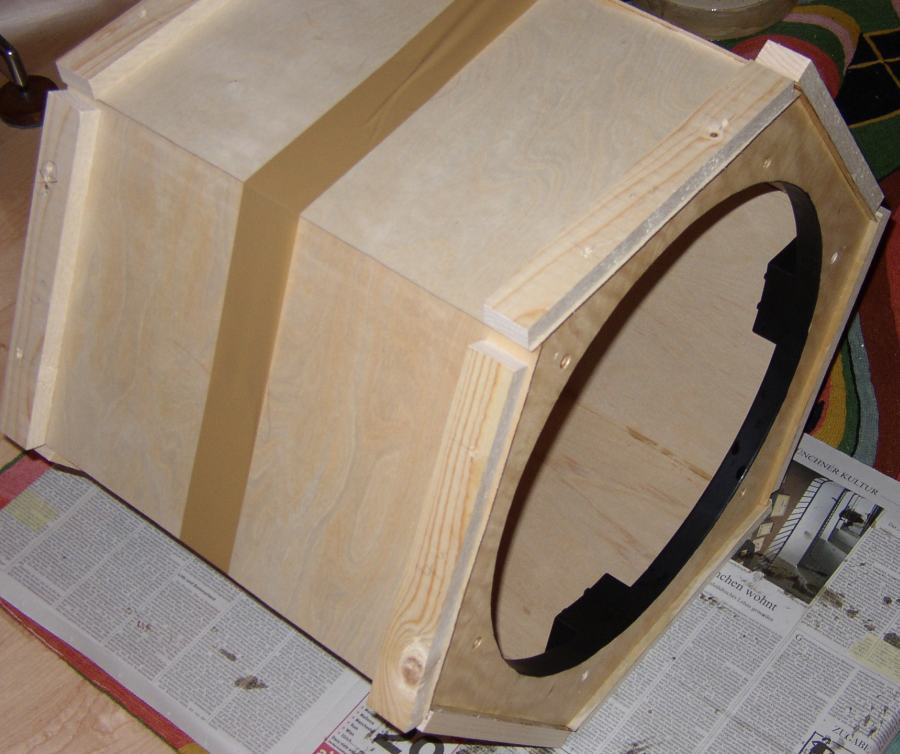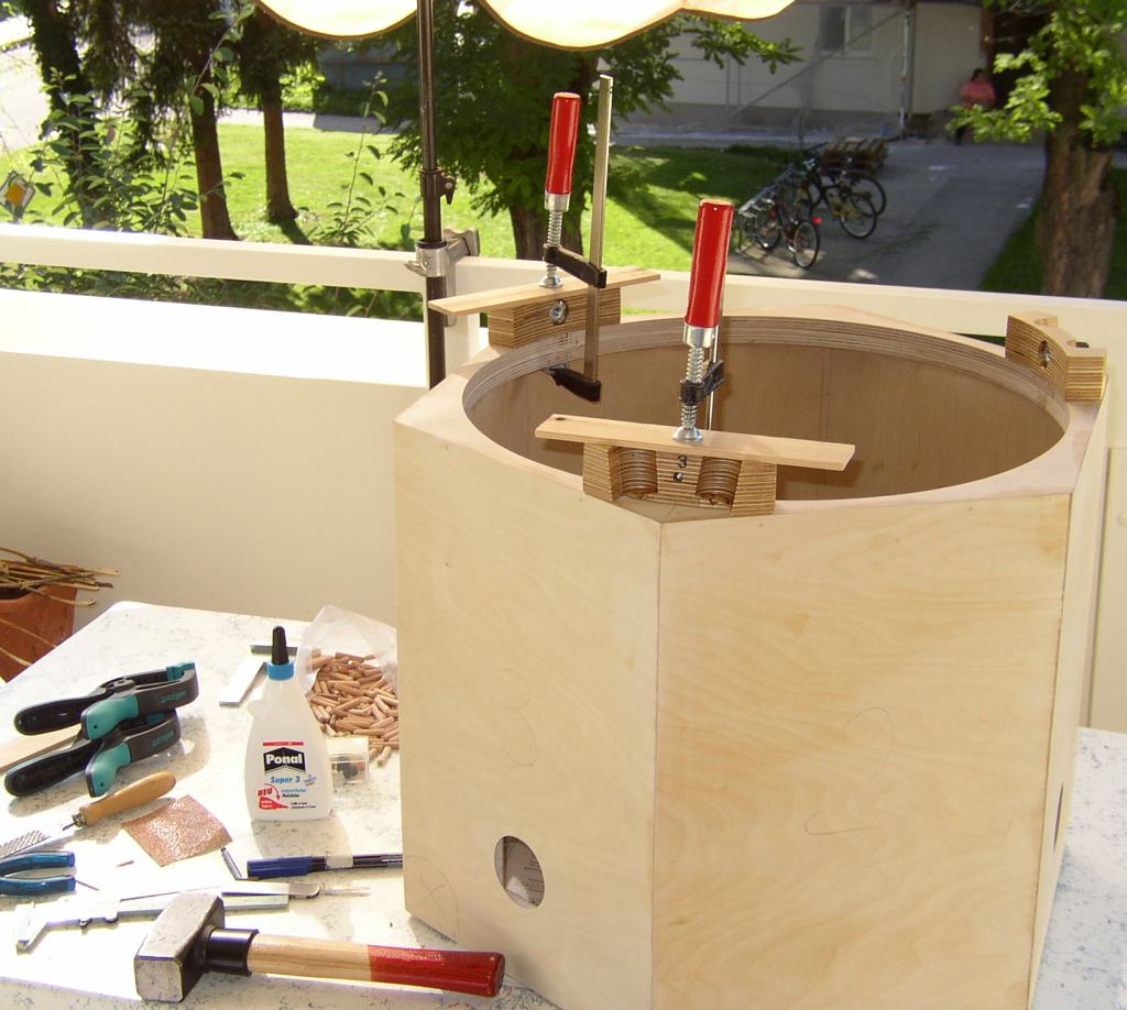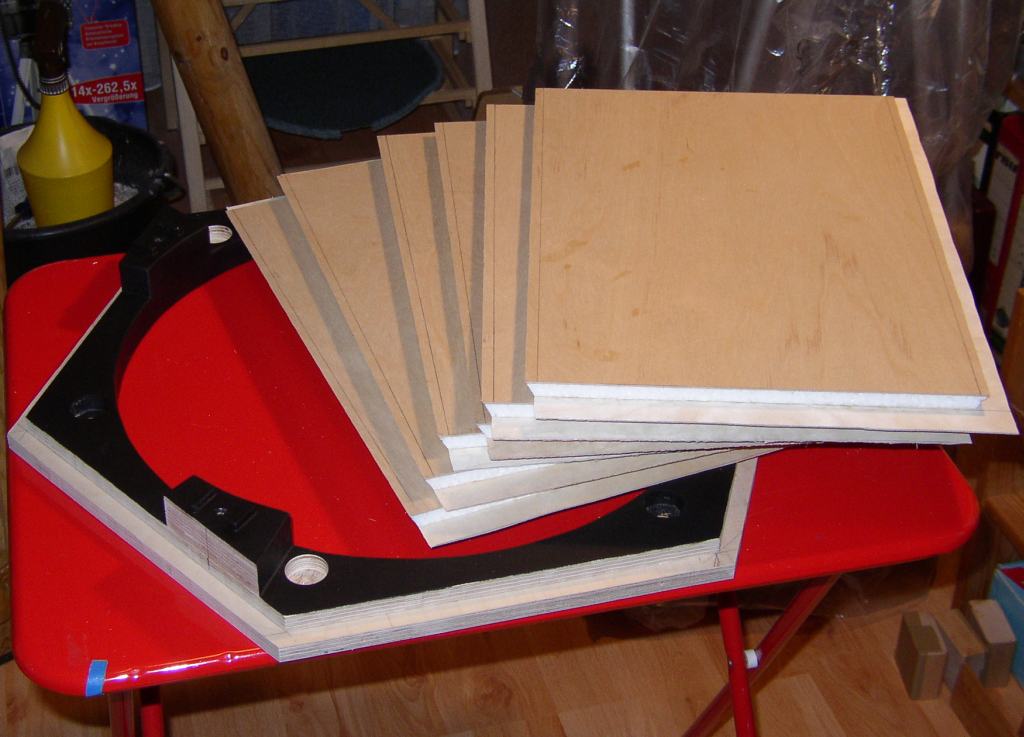 Die Seitenteile der Spiegelbox haben einen 10 mm Styroporkern. Wenn sie sorgfältig vorbereitet und zugeschnitten sind, macht der Zusammenbau keine große Mühe. Oben und unten werden die Seitenteile mit Sechseck-Ringen aus je zwei Lagen 12 mm Multiplexsperrholz zusammen gehalten.