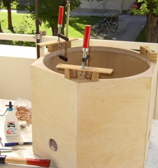 Auf dem oberen Sechseck-Ring werden die Klemmklötze für die Aufnahme der Gitterrohrstangen verdübelt und verleimt. Für die Aufnahme von Verstärkungen zur Befestigung der Höhenräder müssen dann noch passende Aussparungen in den Seitenteilen vorgesehen werden.