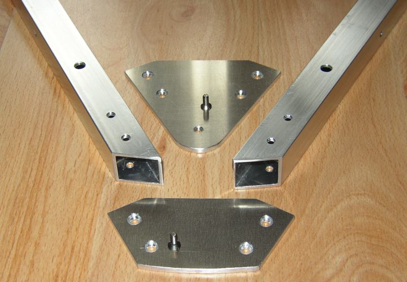 Für die kraftschlüssige Verbindung der Gitterrohrstangen mit Spiegelbox und Hut habe ich die aus meiner Sicht einfach herzustellenden Klemmklötze gewählt. Unten an der Spiegelbox geht das auch ganz einfach und schnell: Stangen in die geöffneten Klemmen einstecken und Schnellspanner (Fahrradzubehör) anziehen.