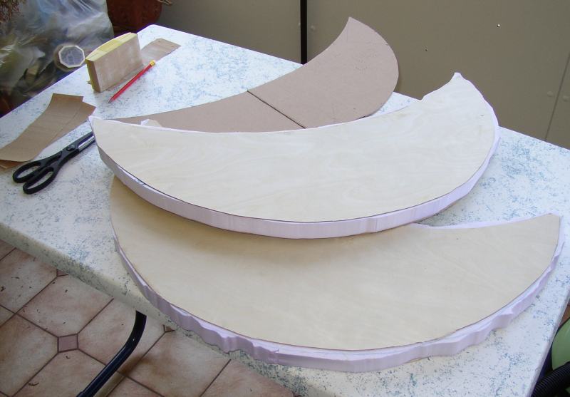 Die Höhenräder (Durchmesser 700 mm) bestehen aus 30 mm dicken Hartschaumkernen und sind rundum mit 1 mm Flugzeugsperrholz beplankt. Nur für die Befestigung an der Spiegelbox habe ich Verstärkungen aus Multiplexsperrholz vorgesehen, weitere Verstärkungsmaßnahmen waren nicht erforderlich. Ursprünglich hatte ich an eine Querverstrebung der überstehenden Hörner der Höhenräder gedacht, das erwies sich aber als völlig überflüssig. Die Steifigkeit der Verbundbauweise ist wirklich beeindruckend. |