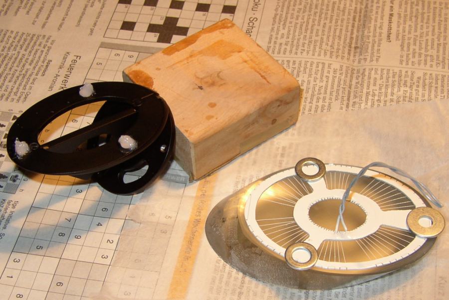 Wegen der oft auftretenden hohen Luftfeuchtigkeit in unseren Breiten schien mir der Einbau einer Fangspiegelheizung zwingend notwendig. Dazu habe ich einen Widerstandsdraht (Konstantan 63 Ohm/m, ca. 1 W /12 V) als Heizdraht auf eine Trägerplatte aus 1 mm dünnem Leiterplattenmaterial so aufgespannt, dass die Wärmeeinwirkung möglichst gleichmäßig auf den Fangspiegel übertragen wird. Die Heizplatte wird bei der Befestigung des Fangspiegels mit drei Silikonblobs an seiner Halterung so zwischen die beiden Teilen eingefügt, dass die Drahtwindungen in engen Kontakt mit der Spiegelrückseite treten. Die Stromzuführung erfolgt einerseits über die fest angeklemmte Spinne und andererseits über einen im Bedarfsfall lose verbundenen dünnen Kupferlackdraht, dessen Störwirkung im Strahlengang des Teleskops vernachlässigbar klein ist - wenigstens im Verhältnis zur Störwirkung eines Taubelags auf dem Fangspiegel. |