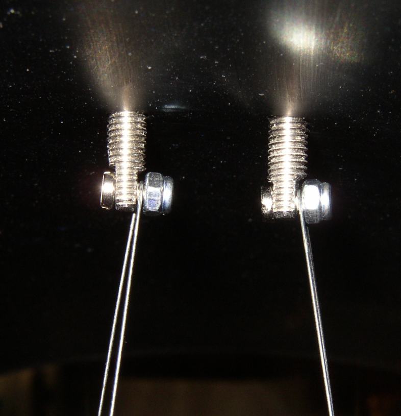 Mir gefällt die technisch bestechende Lösung der Fangspiegelhalterung mittels Spanndrähten. Die Halterung ist nahezu masselos und wirkt sich kaum störend im Strahlengang des Teleskops aus. Hier macht die Bezeichnung "Spinne" auch noch richtig Sinn. Meine Version ist relativ einfach, es gibt da viel verzwicktere Lösungen der Drahtführung bei anderen Teleskopebauern. Allerdings musste ich später erkennen, dass es bei meiner Ausführung notwendig ist, die Drähte am Haltepunkt außen am Hutring fest zu fixieren. Ursprünglich hatte ich sie nur durch ein Loch im Spannbolzen geführt und darauf vertraut, dass die Zugspannung zur Fixierung ausreicht. Dem war aber nicht so: Durch Zug oder Druck auf die Halterung in Richtung der optischen Achse des Teleskops konnte sich die Halterung und damit der Fangspiegel in dieser Richtung verschieben. Deshalb werden die Drähte jetzt nach dem Ausrichten und Spannen der Halterung an den Spannbolzen mit Schrauben eingeklemmt, wie aus der Abbildung ersichtlich. |