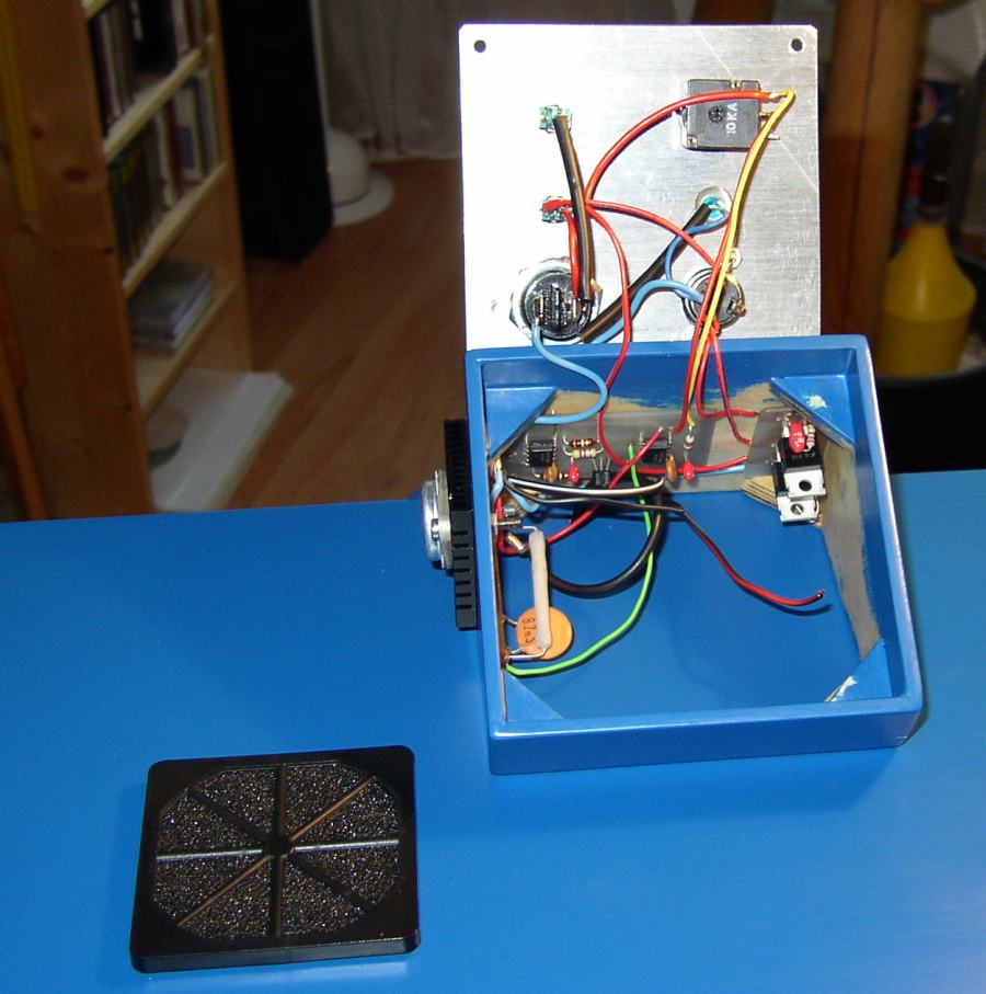 Die erforderliche Elektronik für die Regelung der Ventilatoren und zur Bereitstellung von geregelten Kleinspannungen 3 V und 6 V habe ich in einem kleinen Gehäuse an der Außenseite der Spiegelbox untergebracht. Die Kleinspannungen und natürlich 12 V für die Fangspiegelheizung brauche ich gelegentlich oben am Hut in der Nähe des Okulars. Dazu werden die beiden Schalkästchen über ein steckbares Anschlusskabel verbunden. Als Spannungsquelle dient die Fahrzeugbatterie oder ein externer 12 V Akku mit entsprechender Leistung.