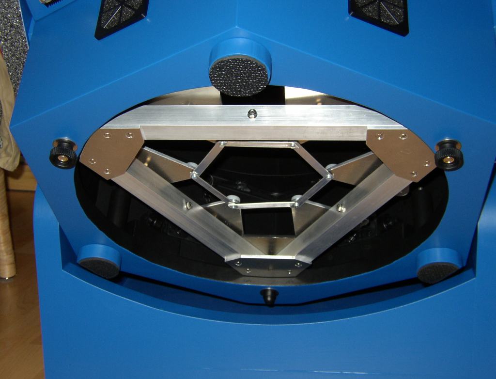 Hier ist die zusammengebaute Spiegelzelle dargestellt und wie sie auf dem unteren Sechseck-Ring der Spiegelbox gelagert ist. Die drei Ecken der Zelle werden gegen starke Druckfedern gedrückt, was eine spielfreie und feinfühlige Justierung des Hauptspiegels ermöglicht.