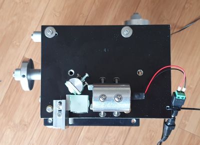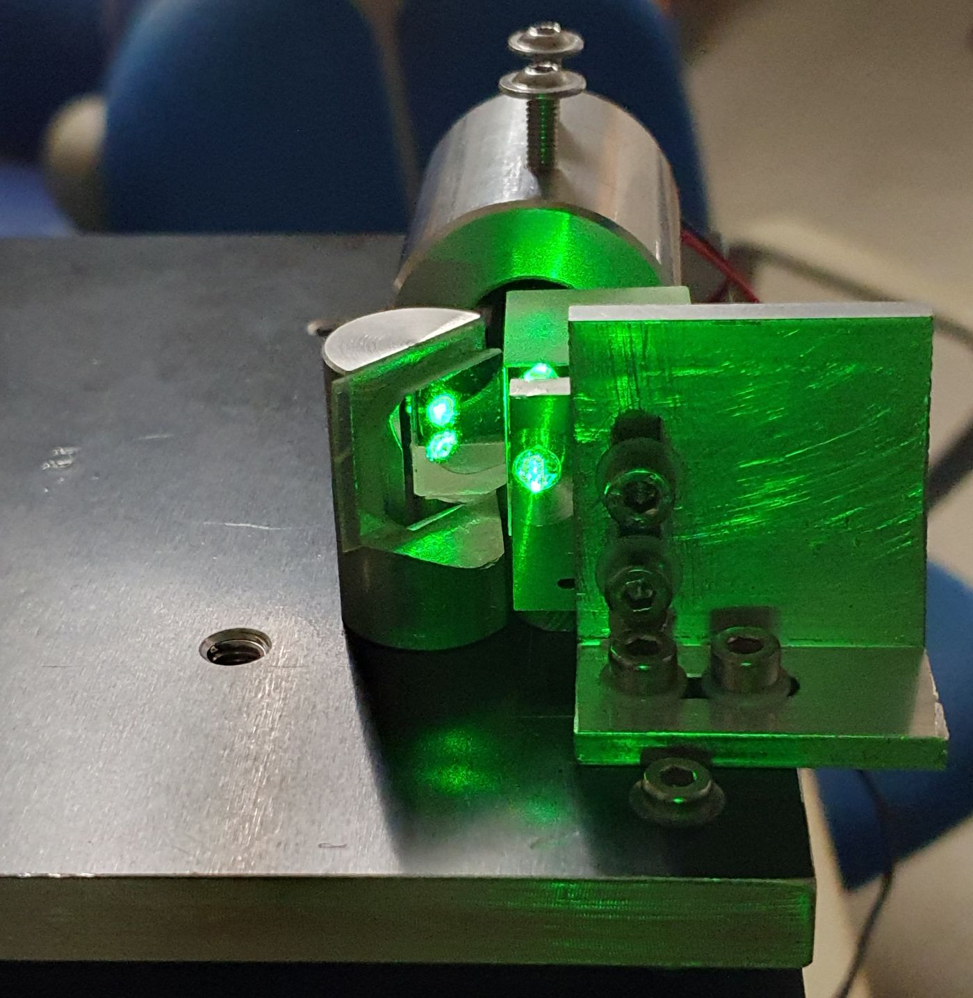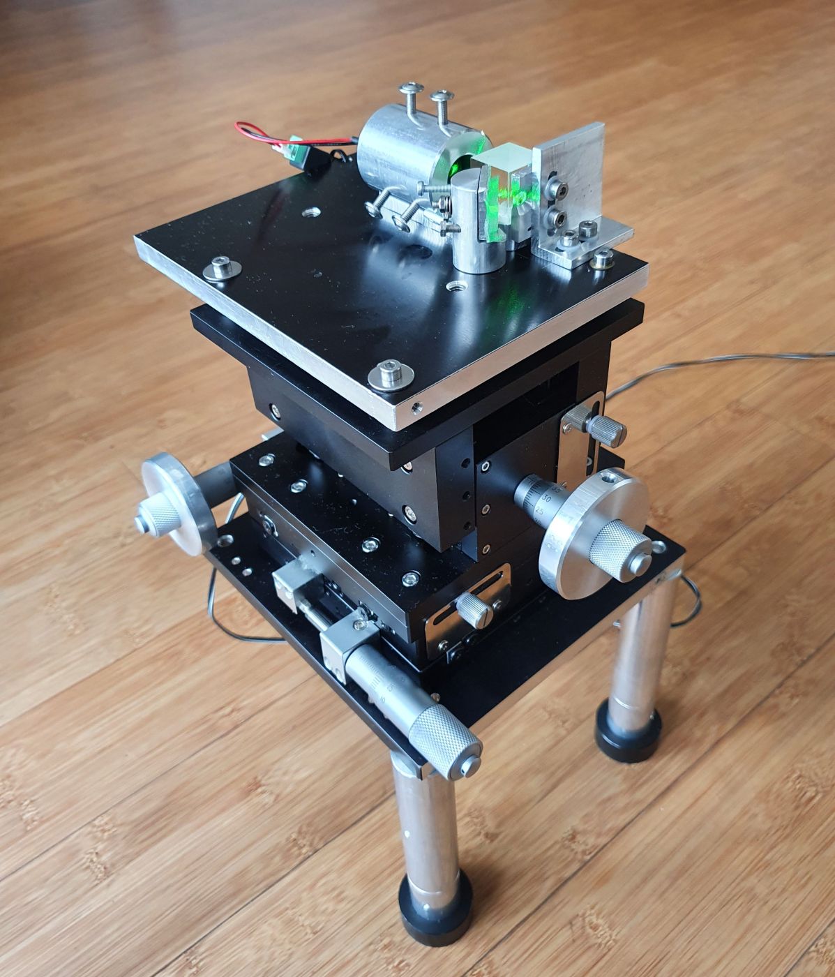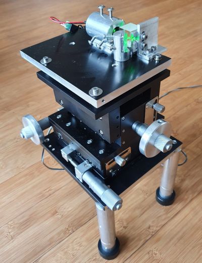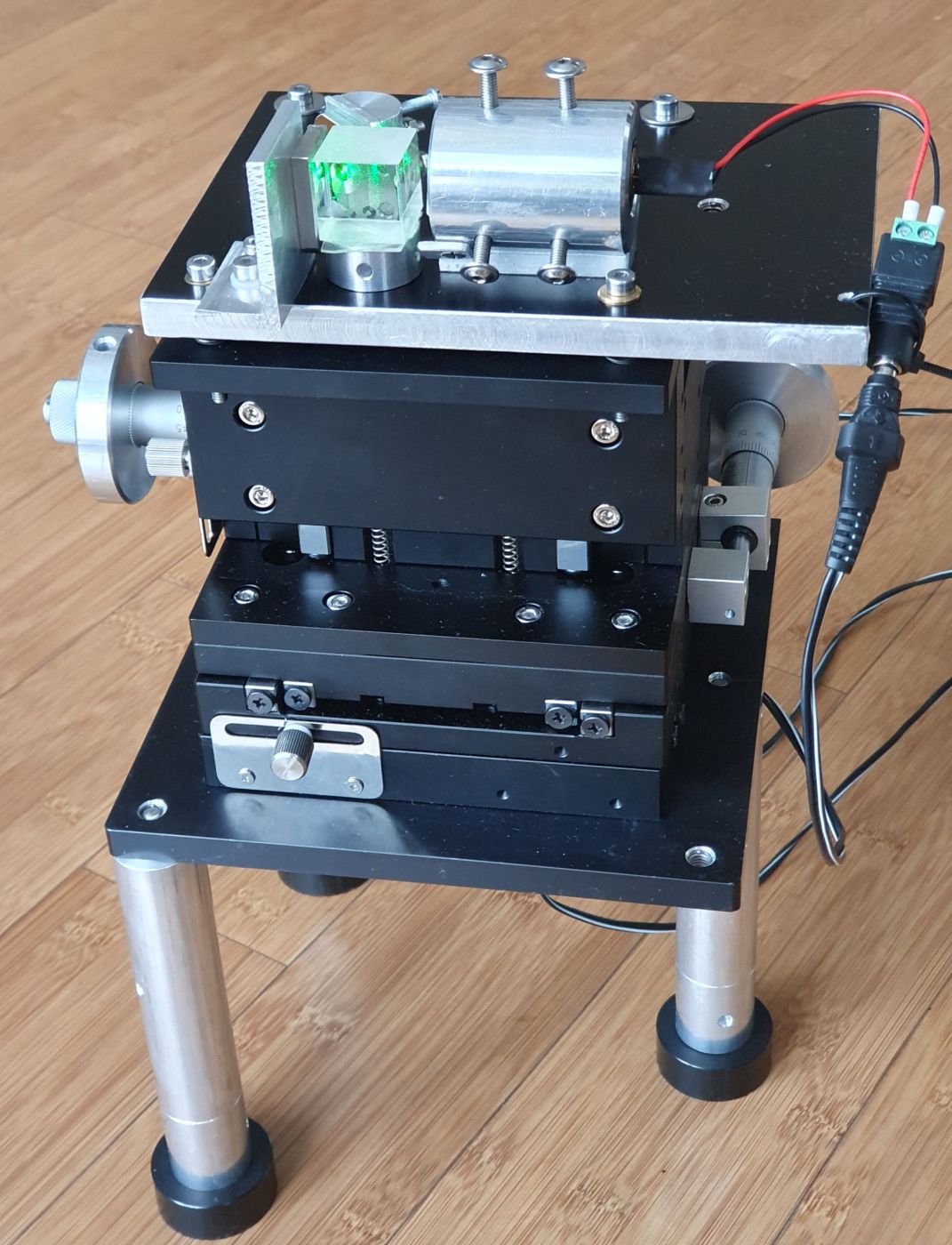 My Bath- interferometer (common path interferometer) in 90° geometry is made with parts, that were selected from the ingenious Alois Ordner, to provide best perfomance: - Well collimated 5 mW Laser (Roithner DPSS Laser module CW532-005F, green with a wavelength of 532 nm) with a focusable 4 mm lens, powered with a stabilised 3V power supply. The non focusable version CW532-005 should work equally well. The testing device is mounted on a 4.3 kg heavy duty XYZ- stage with a platform size of 125x125 mm. The stage stays on 3 feet with 100, 50 and 30 mm segments for rough height adjustment. Thanks to the high total weight of 6.5 kg it stays rock solid and can be fine adjusted in all 3 axes tremor free and without any backlash. |