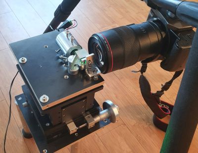 The camera stays at a right angle to the laser beam with the lens opening close to the beam exit of the instrument. I use a 100 mm f/2.8 fix focus low distortion lens + an APSC format camera, which can capture test mirrors of up to f/3.8 complete and without internal beam vignetting. For faster mirrors like f/3.3 a full format camera is needed... or an APSC in combination with a smaller focal length lens. |