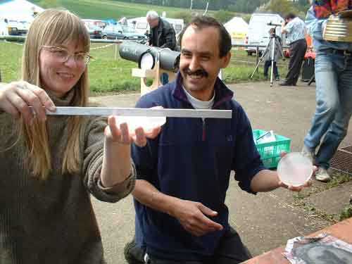 Mit der Glühlampen Reflexmethode; Das ist so zusagen ein grober Foucault Test, um den Krümmungsradius des Spiegels direkt zu ermitteln. Da der Spiegel im Grobschliff -oder Feinschliff Stadium noch nicht reflektiert, muss man ihn mit Wasser benetzen. Hierzu den Spiegel hochkant auf einen Ständer stellen und ordentlich mit Wasser nass spritzen. Ich mache es mit einer Blumenspritze. Sofort danach (bevor das Wasser wieder abgelaufen ist) mit der Lampe am Auge (siehe Bild) sich ca. einen Meter hinter den Spiegel stellen oder legen und versuchen den Reflex der Lampe auf der Mitte des Spiegels mit dem Auge aufzufangen. Bewegt man die Lampe nach oben, bewegt sich der Reflex im Spiegel ebenfalls nach oben. Das ist ein Zeichen dafür, dass man sich mit Auge und Lampe noch innerhalb des Krümmungsmittelpunktes befindet. Nun entfernt man sich langsam immer mehr vom Spiegel und versucht dabei den Reflex im Auge zu behalten. Dieser wird immer größer, bis er schließlich den gesamten Spiegel einnimmt. Entfernt man sich noch weiter weg, so bewegt sich der Reflex gegenläufig: Bewegt man die Lampe nach oben, so geht der Reflex nach unten. Das bedeutet, dass man sich mit dem Auge bereits außerhalb des Krümmungsradius befindet. Durch hin und her probieren kann man die Stelle finden, wo der Reflex schlagartig ohne Vorzugsrichtung rein und rausläuft. Man befindet sich nun mit dem Auge genau im Krümmungsmittelpunkt, die Entfernung Spiegel - Auge ist der Krümmungsradius ROC. Die Brennweite f (also die Entfernung wo Strahlen aus dem Unendlichen wie z.B. Sterne fokussieren) ist genau die Hälfte davon: f=ROC/2. Beim Grobschliff sollte einem die Bestimmung des Radius auf ca. +- 10 cm genau gelingen. Nach dem Karbo 180 kann man es schon auf +- 2 cm bestimmen. Damit ist dieser Test genauer, als mit dem Messschieber. |